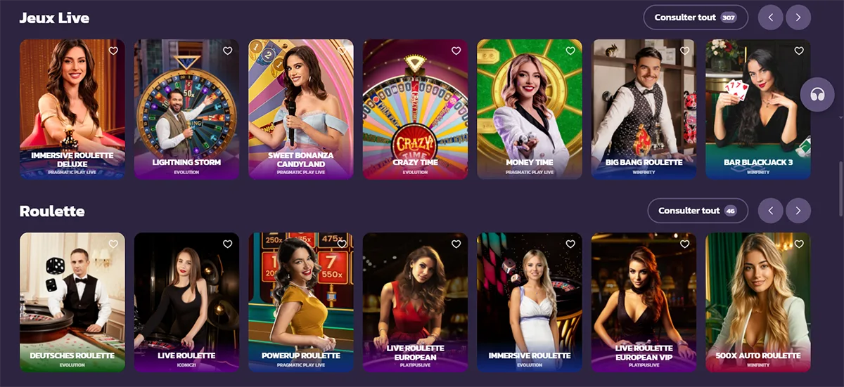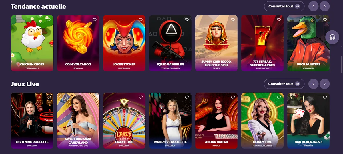 - Jeux : Règles, fournisseurs (NetEnt, Pragmatic Play, Evolution Gaming)