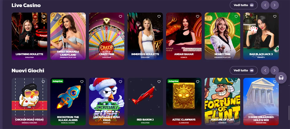 Aggiorniamo costantemente la nostra libreria con giochi nuovi dai migliori fornitori internazionali. Le ultime aggiunte includono Temple Tumble, Sweet Bonanza e Lava Coins, titoli che combinano grafica moderna e funzionalità innovative.