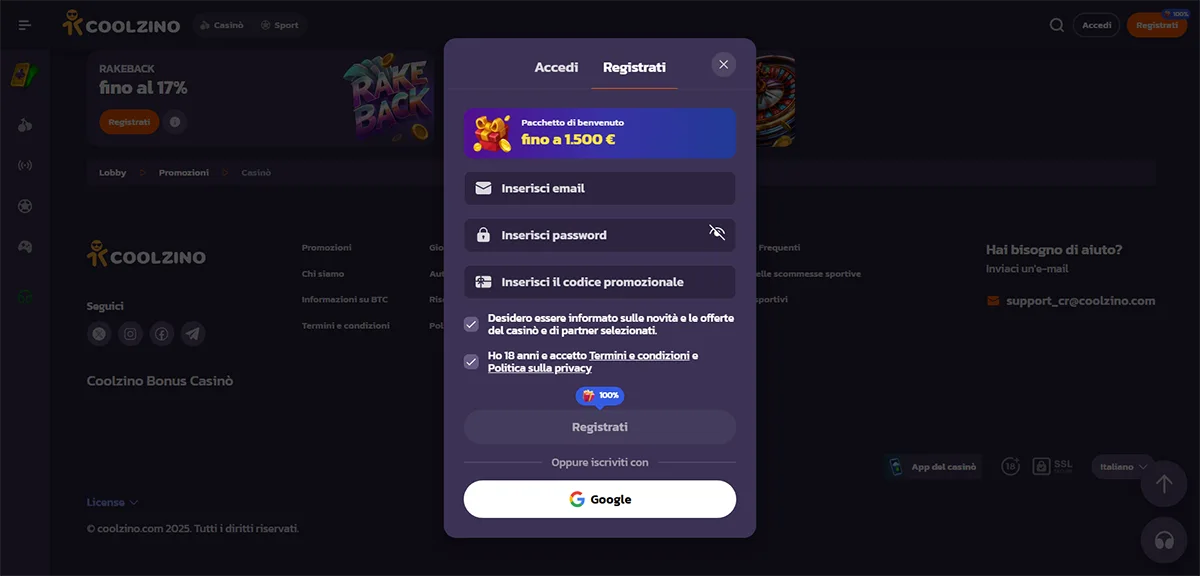 Il team di assistenza clienti di Coolzino Casino garantisce supporto professionale in lingua italiana 24 ore su 24. La chat dal vivo rappresenta il canale principale per contattare direttamente i nostri specialisti del servizio clienti.