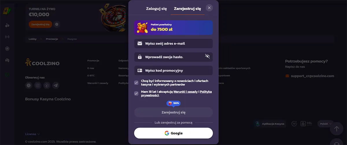 Na końcu zaznacz pole potwierdzające, że masz ukończone 18 lat i akceptujesz regulamin. Możesz też wpisać Coolzino kod promocyjny, jeśli posiadasz. Otrzymasz wtedy bonus za rejestrację, który jest świetną opcją dla nowego gracza.